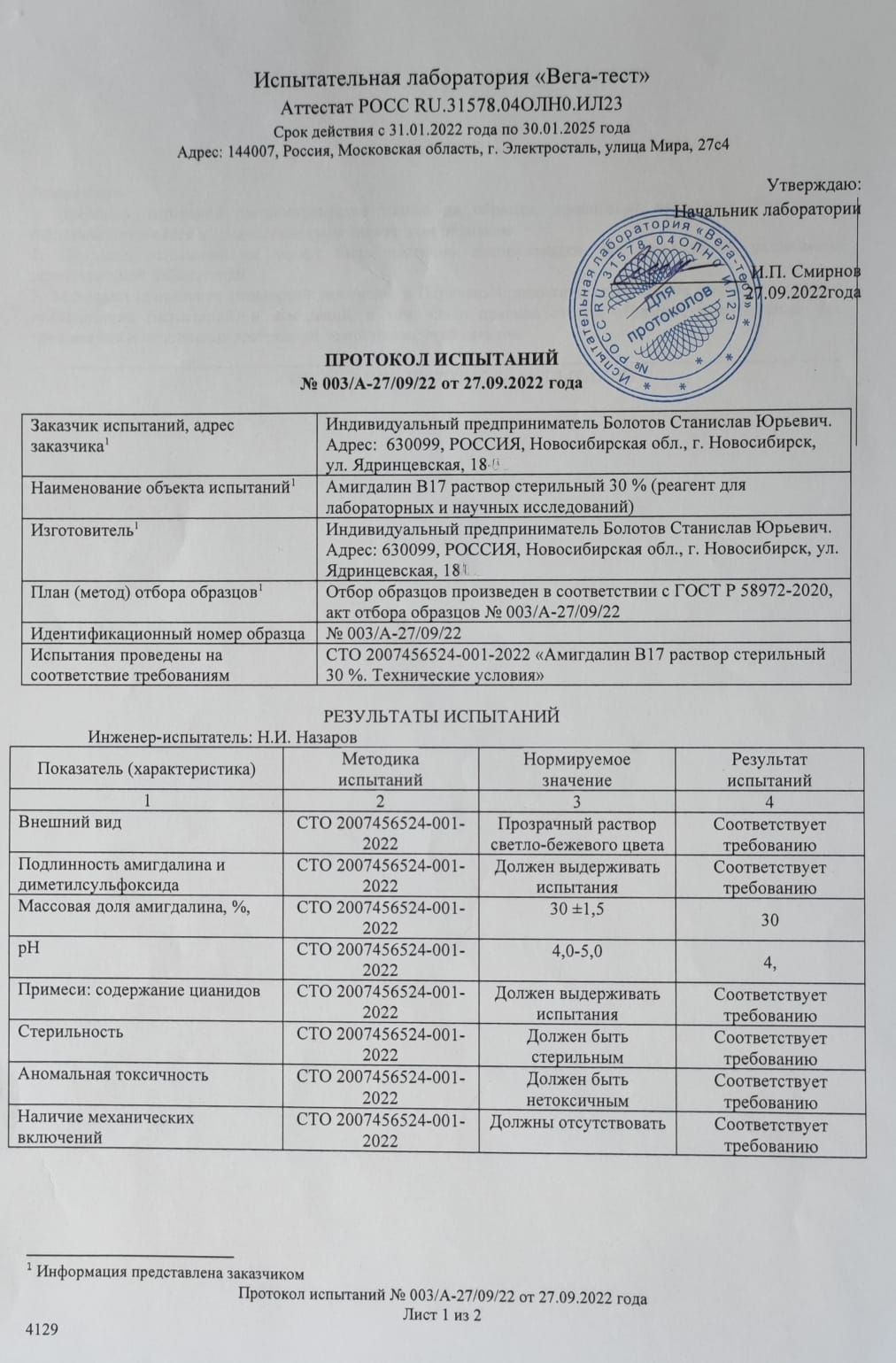 Амигдалин В17 в растворе производства S.A.I.D является эталоном стерильной продукции. Наша лабораторя занимается исследованиями метаболических процессов в живых клетках и данный раствор более чем подходит для подобной работы.